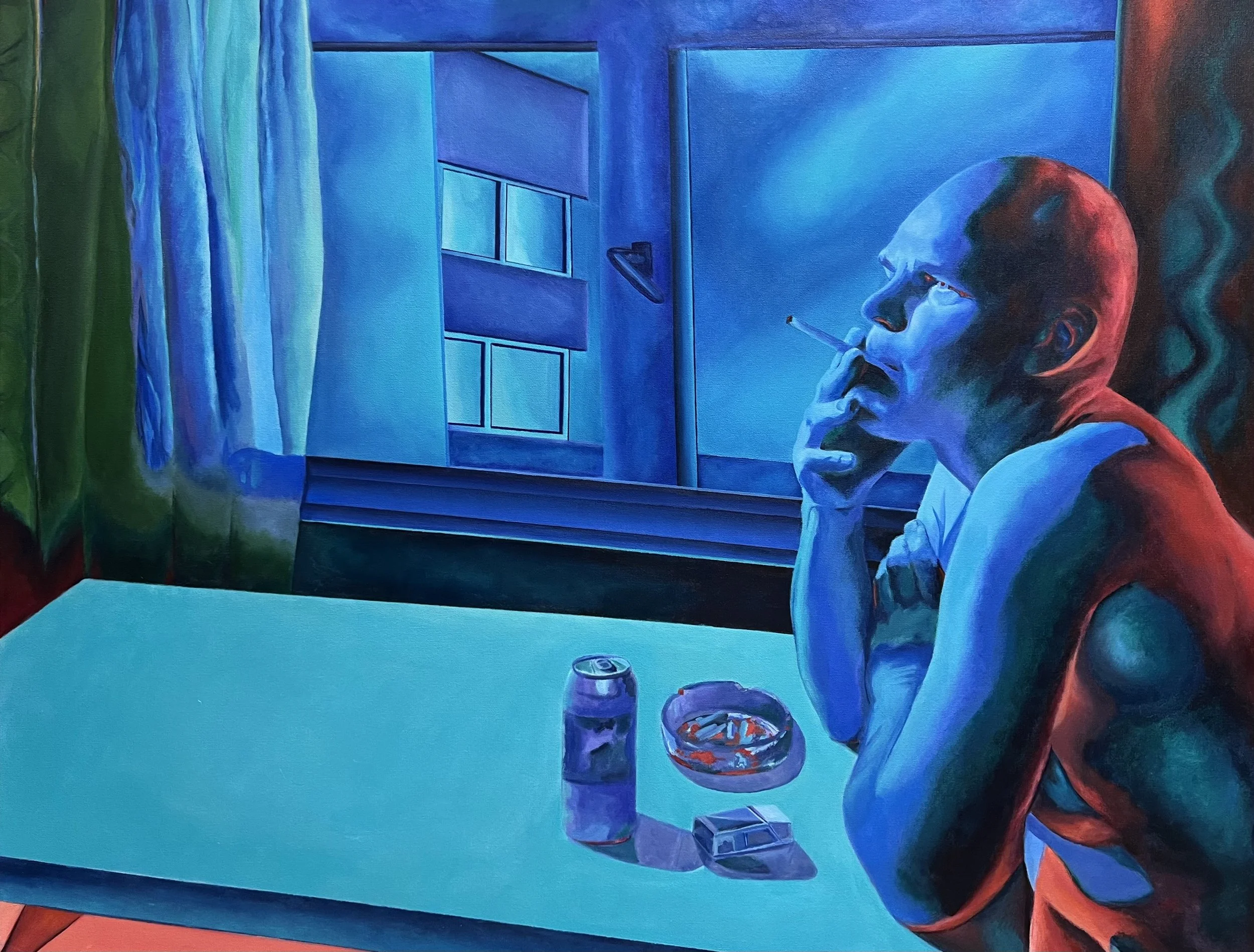 In this moody piece, the man sits, collecting his thoughts from the day. Was it a good day? A bad one? He seems calm, yet concerned. It is up to the viewer to interpret the overall tone and to figure out the look in his eyes.